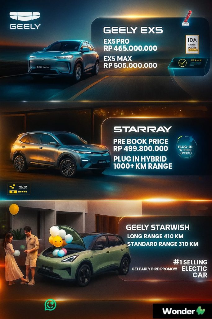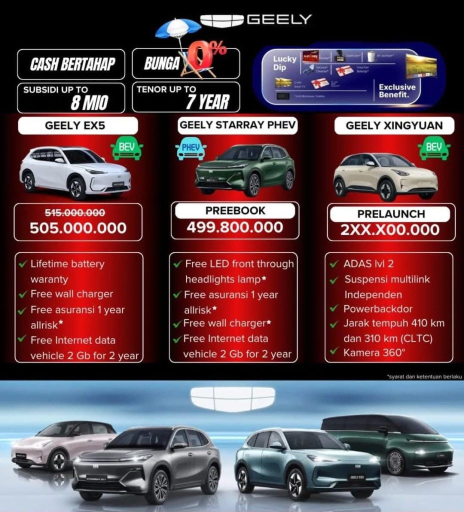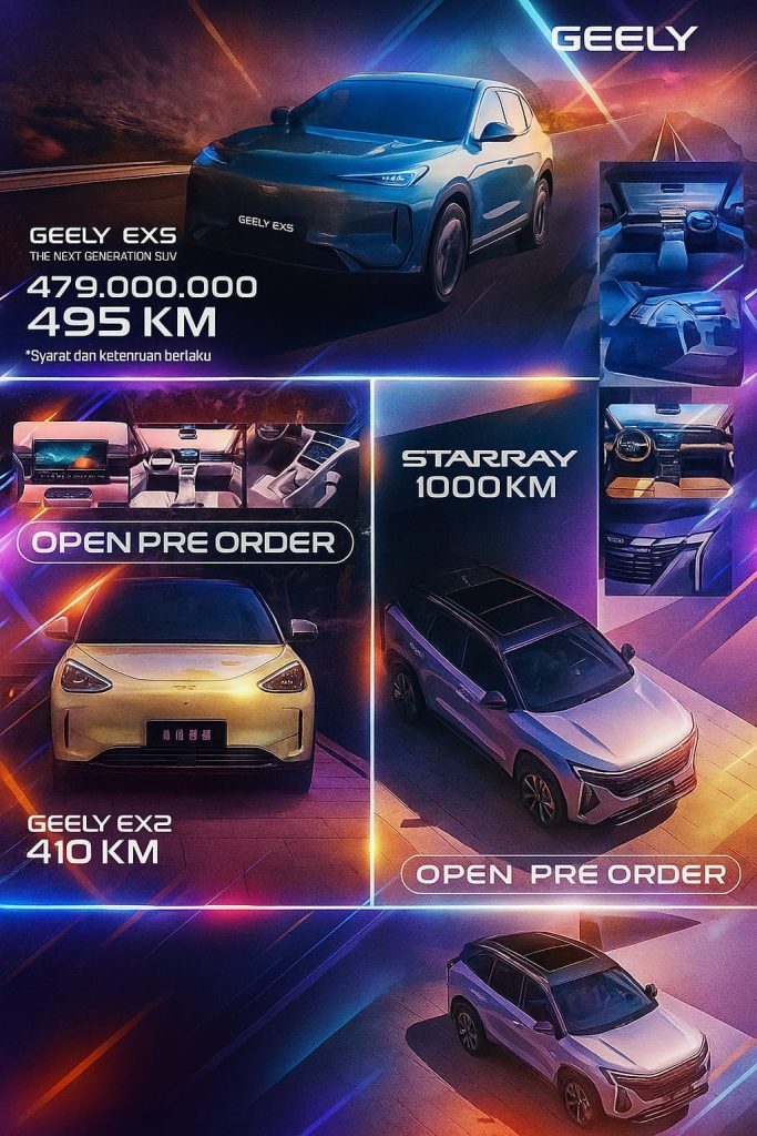 Geely adalah perusahaan otomotif global yang berkomitmen untuk menciptakan masa depan mobilitas yang lebih ramah lingkungan dan berkelanjutan. Dengan inovasi terdepan, Geely fokus pada pengembangan kendaraan listrik (EV) yang mengedepankan efisiensi energi dan mengurangi dampak lingkungan. Kendaraan listrik Geely menawarkan teknologi canggih, kenyamanan, dan desain modern, menjadikannya pilihan ideal bagi mereka yang peduli akan masa depan bumi. Dukung perubahan positif dengan memilih kendaraan ramah lingkungan dari Geely.